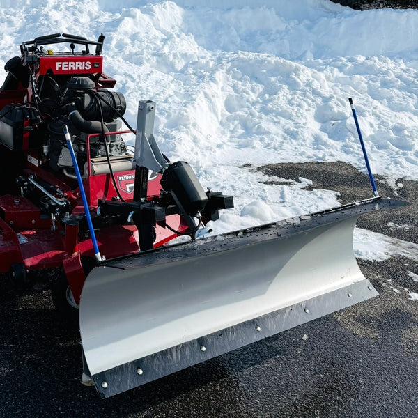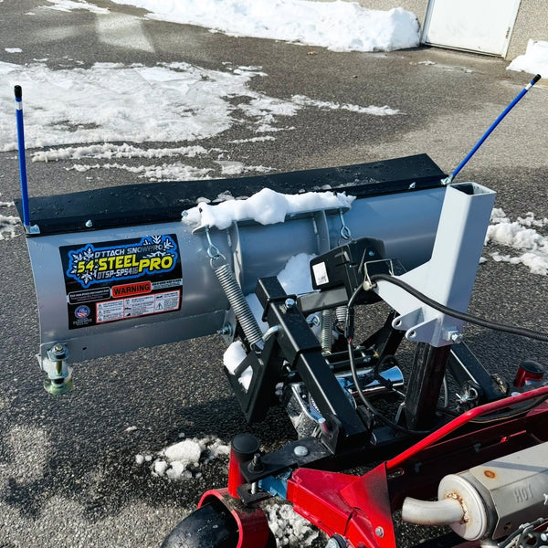 DTSP-SP5416-C model for most commercial Zero Turn stand on and seated mowers. SnowPro (DTSP-SP5416-C) by D'ttach comes complete with everything you need to start using your mower to plow snow fast. Price includes a Heavy Duty 2 arm ProSeries hitch mount for the attachment as well as an electric actuator to raise and lower the snowplow attachment, wire harness & switch and the snowplow attachment.
